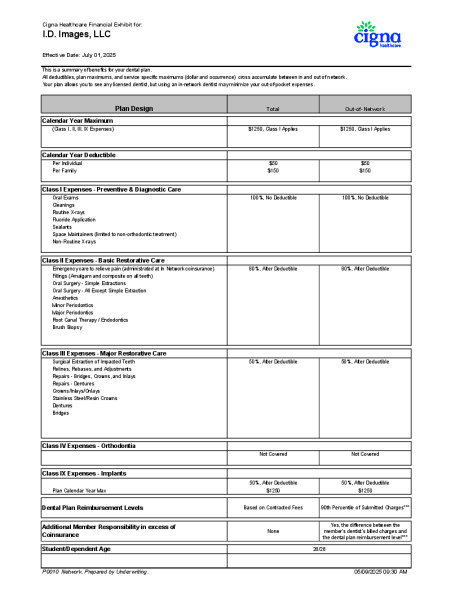 Regular dental exams can help you and your dentist detect problems in the early stages when treatment is simpler, and costs are lower. Keeping your teeth and gums clean and healthy will help prevent most tooth decay and periodontal disease and is an important part of maintaining your medical health. I.D. Images offers a dental plan through Cigna Healthcare. Your dental plan offers in- and out-of-network benefits utilizing Cignaโs networks.